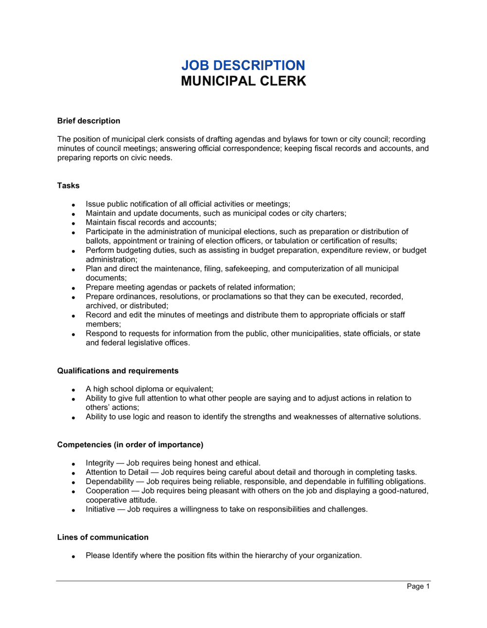 We have included transportation clerk job description templates that you can modify and use. Keep portfolio of evidence of projects. CLERK OF WORKS DEPARTMENT.