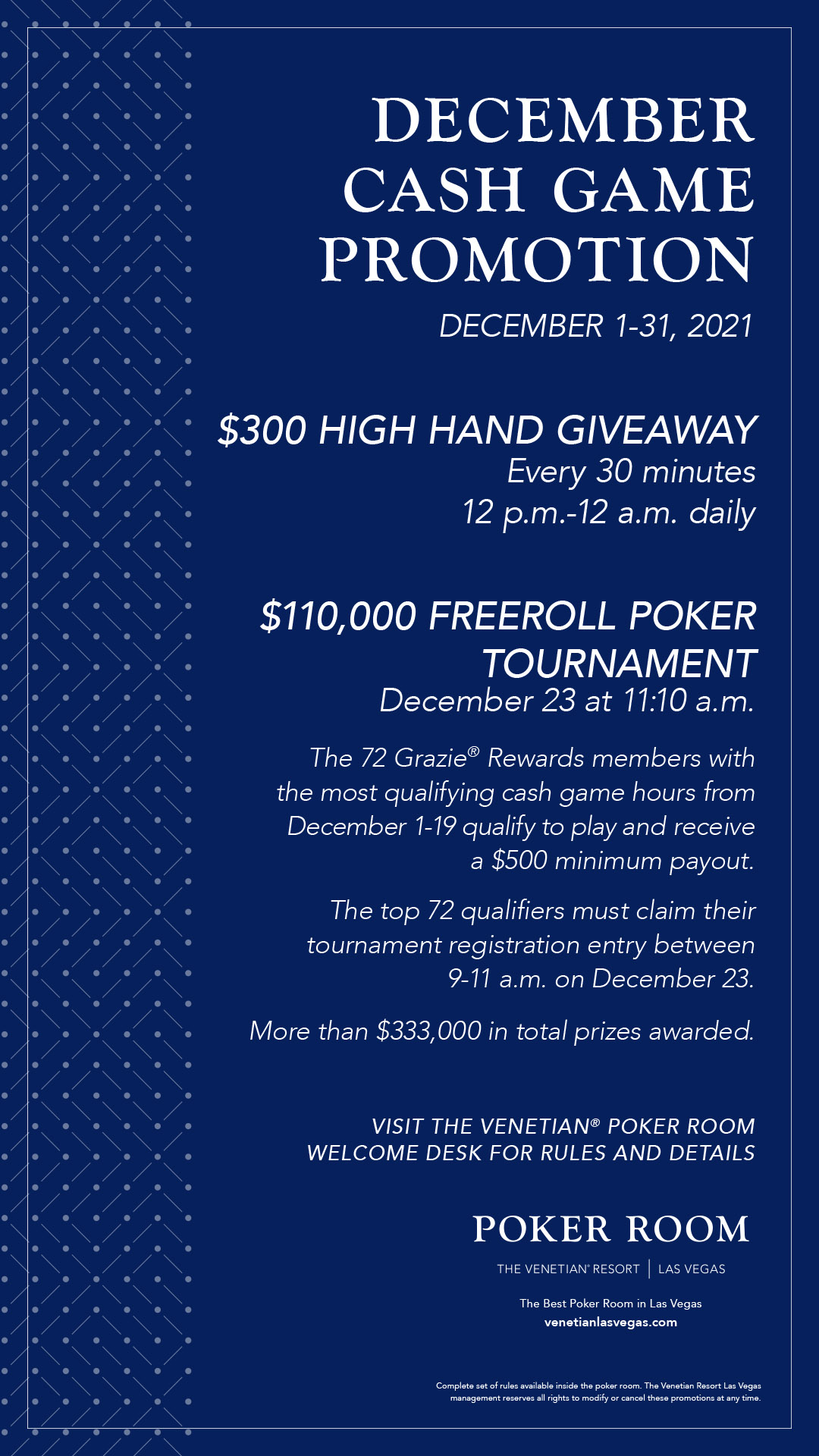 Venetian Poker Room On Twitter December Cash Game Promotions 300 High Hand Giveaway 12 Pm 12 Am Daily Every 30 Minutes 110 000 Freeroll Tournament Dec 23 11 10 Am 72 Players With